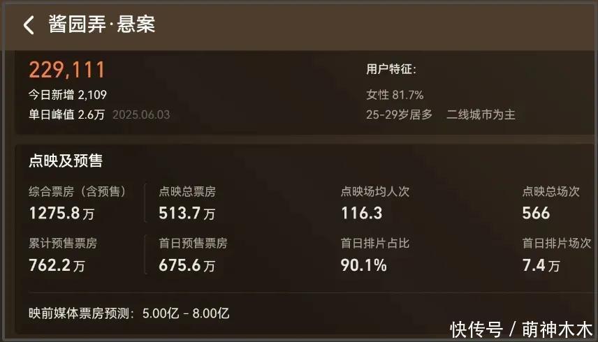 而在网友看来,《酱园弄》的票房还有下降空间,一部悬疑片分为荆棘两部上映,首映口碑南北极分化,剧情差评多一面倒,2亿差未几,3亿拼凑、5亿最多了。