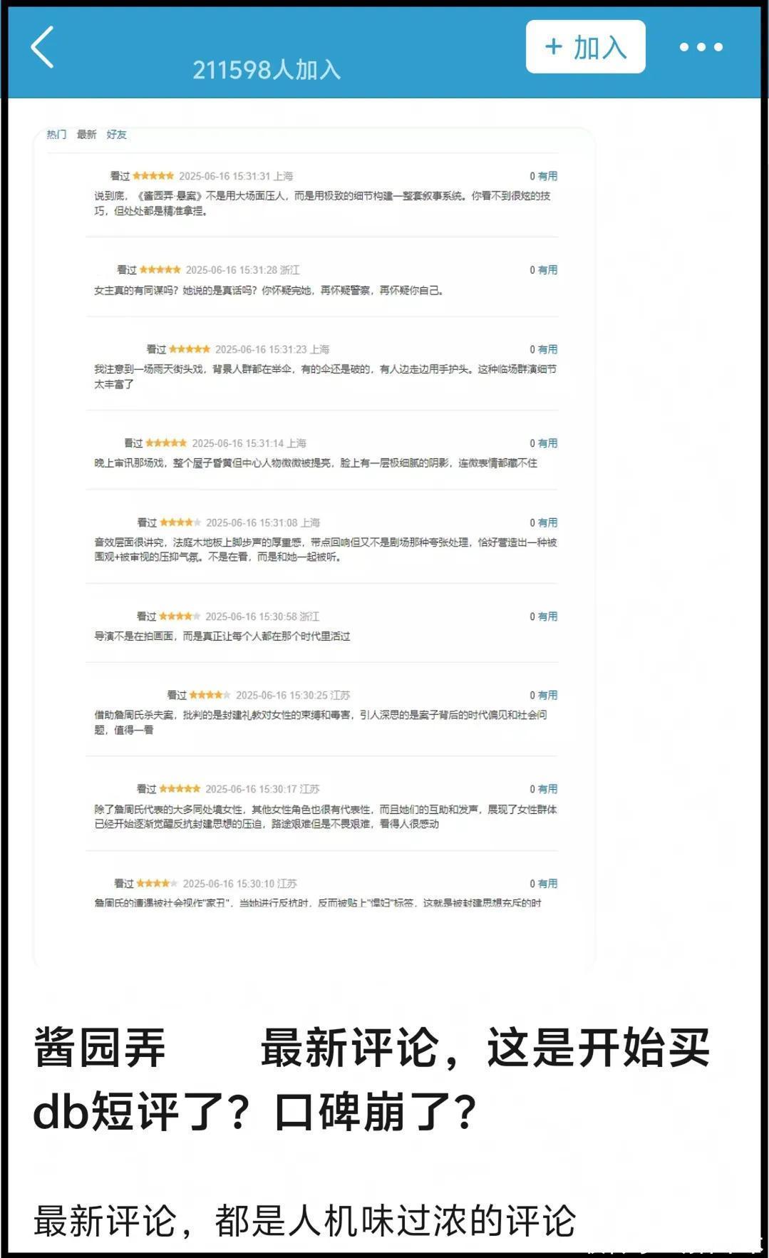 不啻一位网友发现,自从《酱园弄》首映口碑不稳之后,背后总有东说念主手脚时常,从电影短评区斯须空降无数东说念主机好评到平台掩饰杨幂台词片断替换评述区,无一不是为了珍视电影口碑。