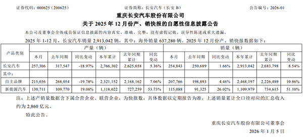 企业筹画层面,长安汽车2025年销量291.30万辆;其中新动力汽车销量111万辆,同比增长51.1%。从子品牌来看,长安启源、深蓝汽车和阿维塔的销量分袂为41.1万辆、33.31万辆和跳跃12万辆,同比均终了两位数以上的正增长。此外,长安汽车2025年全口径汇总交易收入约2860亿元,距离总销量300万辆、收入3000亿元的标的仅一步之遥。