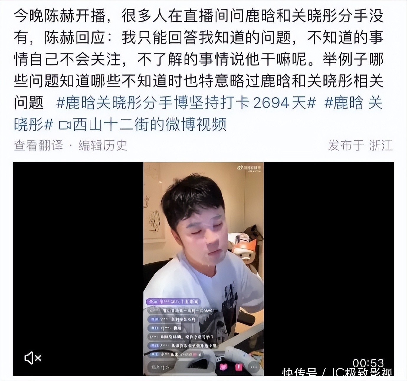好手足陈赫直播的时候面对满屏计议鹿晗关晓彤的情谊情状,他不语,仅仅一味地升沉话题。