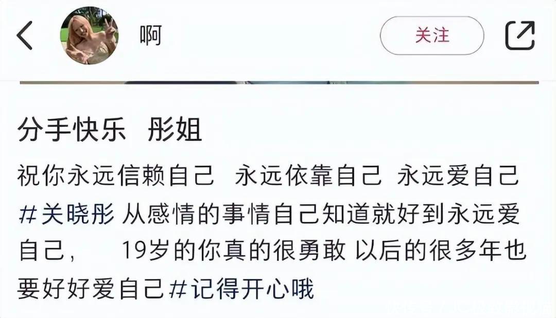 各路东说念主马纷繁下场吃瓜,除了看吵杂的,最令东说念主颤抖的是关晓彤的大粉,果然成功发文祝贺关晓彤诀别怡悦,祝她以后能好好爱我方。