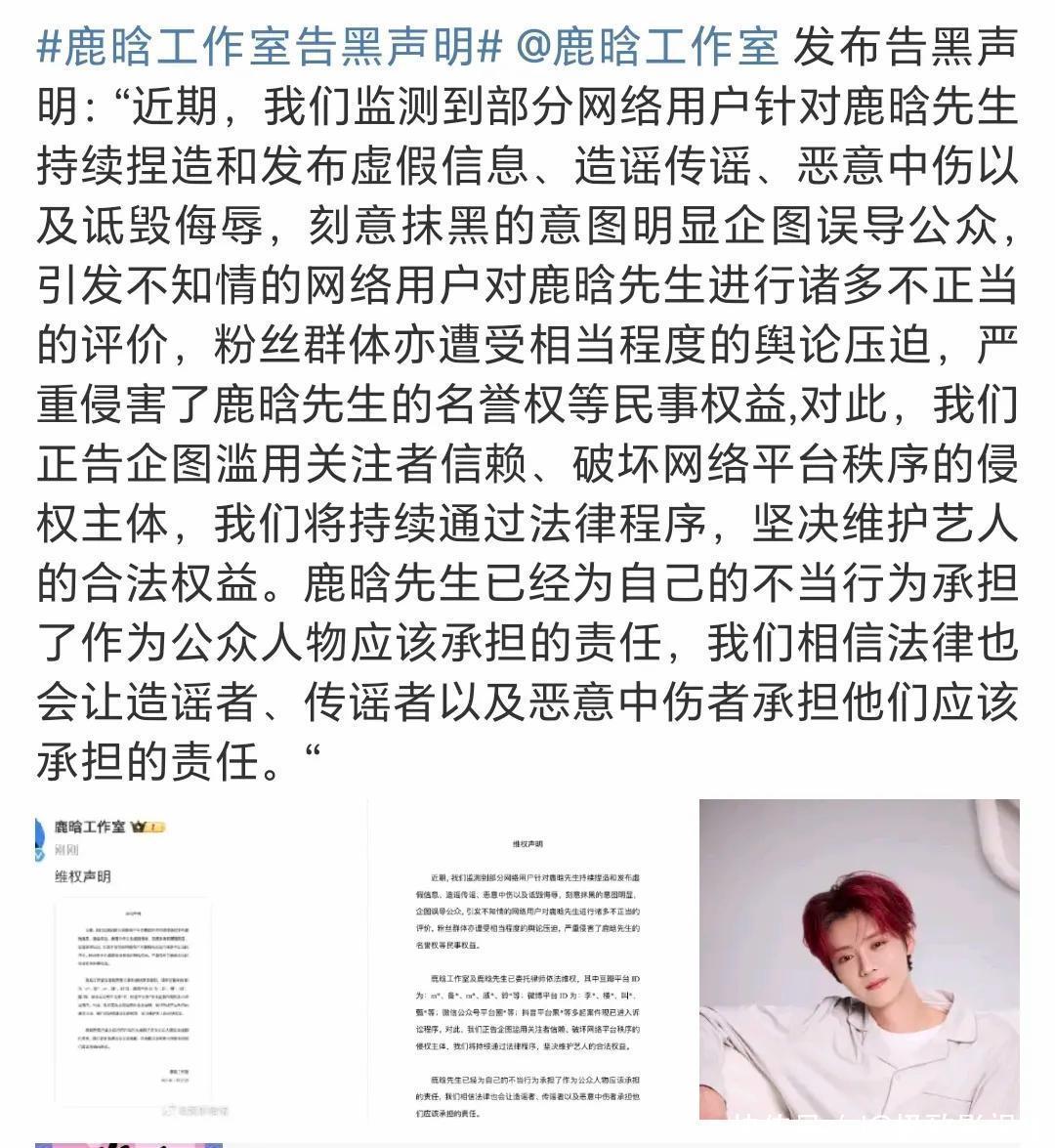 天然鹿晗责任室发了声明,责难网友责难,宣称要告黑粉。