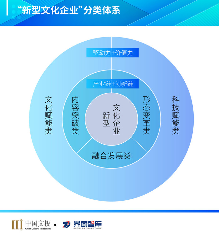 从“产业链+创新链”视角,本次筹商将“新式文化企业”分为“内容毒害类”、“形态变革类”和“交融发展类”三个主要类型,这一分类既体现了“参加—过程—产出”的产业全链条逻辑,又精确对应了“家具创新—过程创新—因素创新”的三维创新框架;从“驱能源+价值力”视角,本次筹商将“新式文化企业”分为“科技赋能类”和“文化赋能类”两个主要类型。两个视角互相补充,共同酿成“3+2”新式文化企业分类体系。其中,“产业链+创新链”视角强调企业“创新发生在那处”,而“驱能源+价值力”视角则回话“创新由何运转、创造何种价值”。