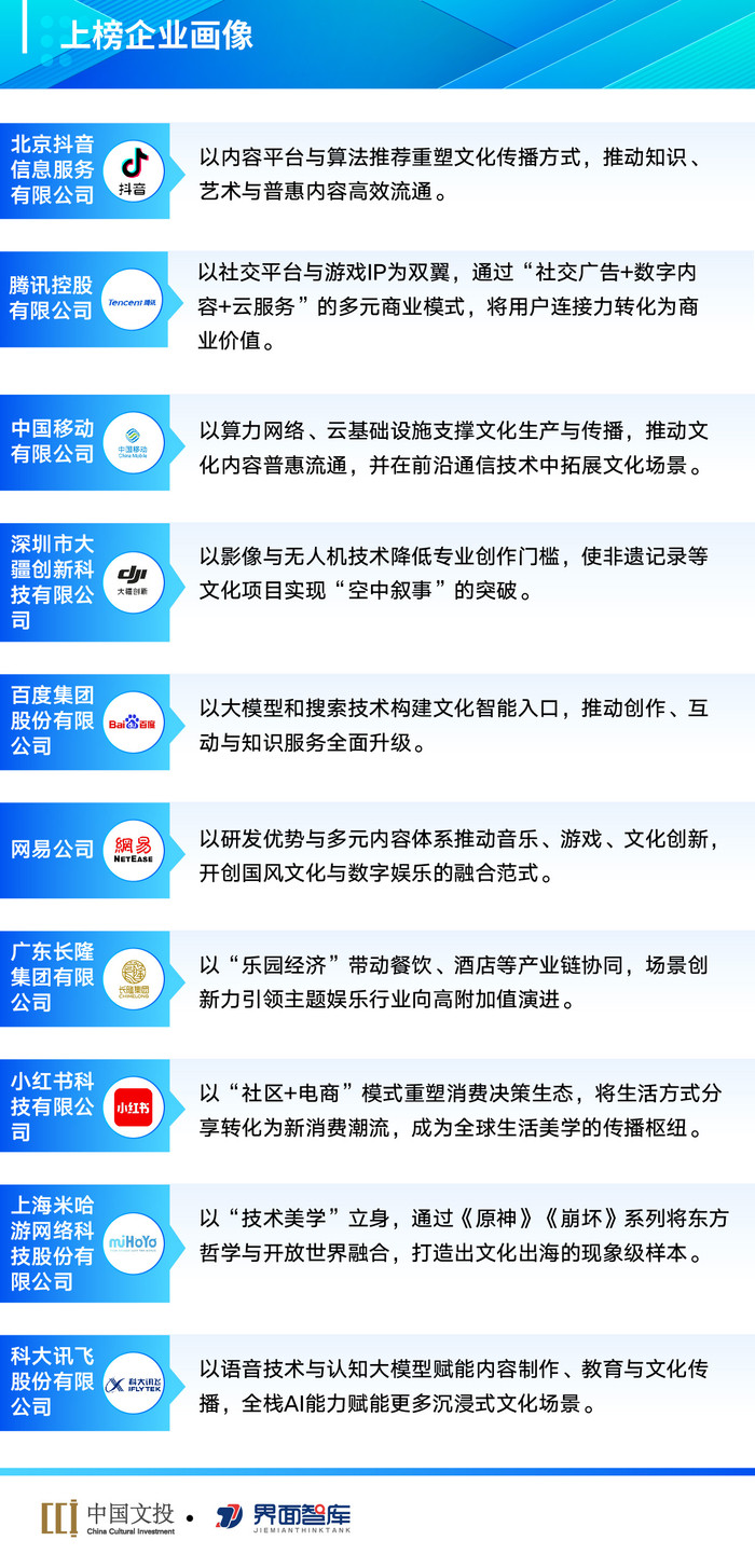 本次上榜的20家“新式文化企业”呈现出多元共生、特质见解的发展款式,共同勾画出“新式文化企业”的完好生态图景,为行业诞生了发展标杆和履行范本。其中,既有抖音、腾讯、中国搬动这么以时代底座、算力平台和基础枢纽才能等赋能文化产业链的科技引颈者,也有游科互动、可可豆动画等深耕细分赛说念的内容新锐,还包括大疆、影石创新这种以“硬件+算法”重塑文化体验的终局创新者。