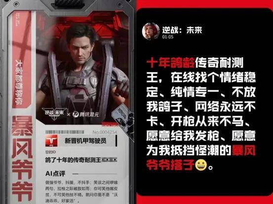 不仅如斯,上线前,《逆战:畴昔》就推出了预创角、抢ID等预热行径,且辅以AI道理点评,有位玩家自嘲苦等了十年,从当初的“狂风少年”成为了“狂风爷爷”,让东谈主看了哭笑不得,这情感牌打得响当当。和张杰一样让逆战玩家忘不掉的缅念念,还有昔日猎场的一声声“苍老,发把枪”! 在上线本日,官方晓示邀请旭旭宝宝、陈伯、大司马、烧饼哥四位苍老级主播,举办“苍老发枪夜”行径。并发布了四位苍老共同演绎的《苍老你好吗》MV,让不少逆战老玩家直呼爷青回。