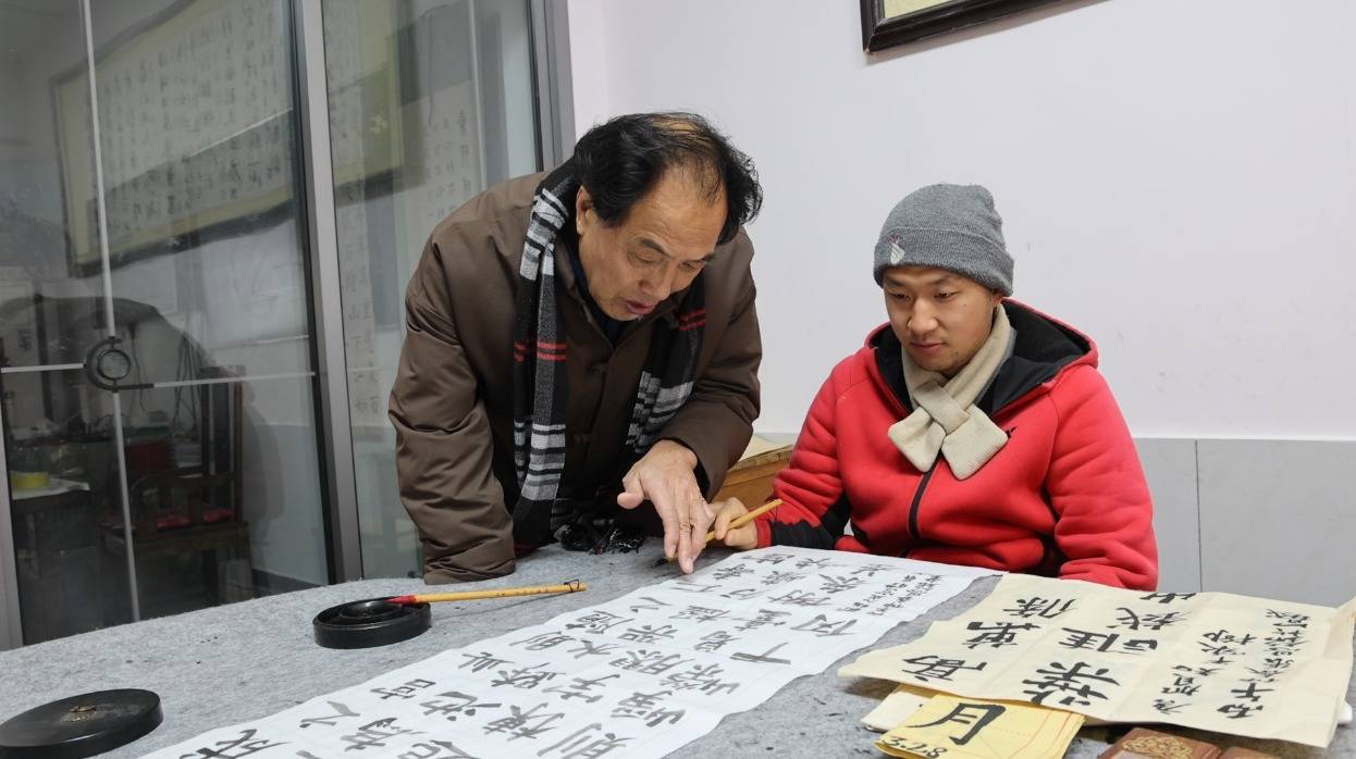 杨捍东正在教诲书道。(通信员 李勤 摄)