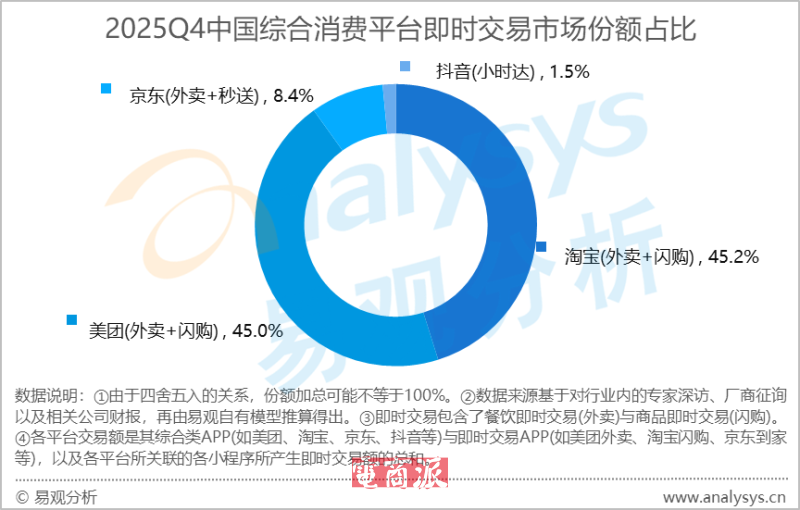 此前,第三方机构易不雅分析发布的一份申报知道,阛阓份额方面,2025年第四季度,淘宝即时走动成交额拿下45.2%的阛阓份额,位列第一;好意思团即时走动成交额以45.0%的份额位居第二;京东即时走动成交额则以8.4%的份额位列第三。