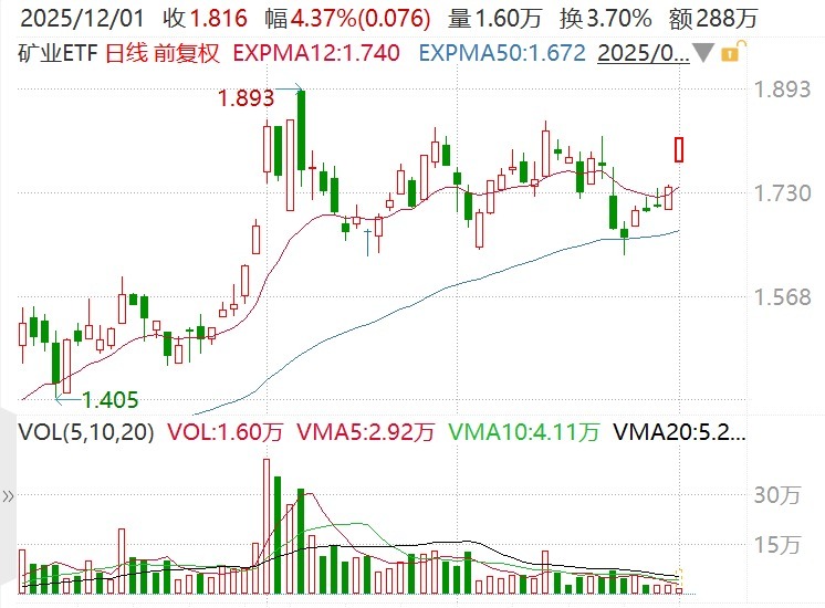 12月1日,A股白银、铜等金属板块集体大涨,湖南白银、白银有色、江西铜业、兴业银锡等多股涨停,云南铜业、洛阳钼业、铜陵有色、紫金矿业等涨超7%。矿业ETF(159690)高开高走,松手发稿高涨4.37%。