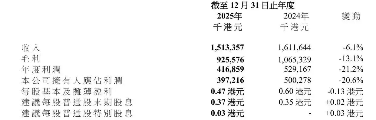此外,公司2025年的净财务收益为41.2百万港元,其中包括财务收益达46.8百万港元。财务收益较旧年减少10.5百万港元主若是由于平均短期银行进款利率下降。